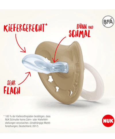 Chupo NUK Signature de silicona, con forma adecuada para el desarrollo oral. Diseñado con amor y pensado en la naturaleza. Este chupo es ideal para satisfacer la necesidad innata de succionar de tu bebé. Su diseño imita la forma del pezón durante la lactancia, promoviendo un desarrollo oral saludable. Es plano, delgado y estrecho, permitiendo que la lengua tenga suficiente espacio para movimientos naturales. Reconocido por ortodoncistas, asegura que no cause problemas dentales ni de mandíbula. Además, cuenta con un nuevo diseño encantador que lo hace aún más atractivo. Viene en una caja reutilizable, ideal para mantenerlo limpio y protegido. Fabricado en Alemania, libre de BPA y cumple con las normas de seguridad europeas.