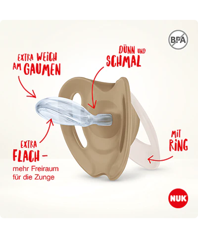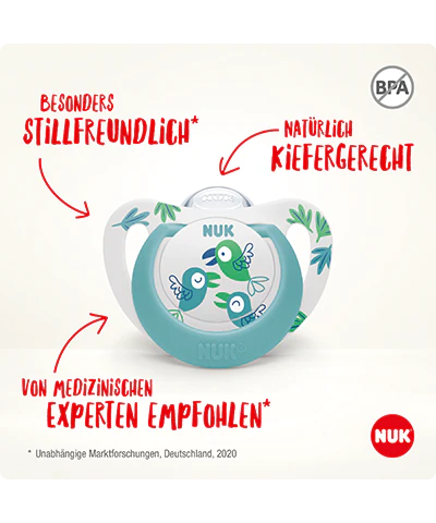 NUK Star Chupo de Silicona, adecuado para la mandíbula, 0-36 meses, libre de BPA, 2 unidades. El chupo NUK Star calma como ningún otro. Confía en él. ¿No es lindo saber que hay alguien en quien siempre puedes confiar? El chupo NUK Star es uno de esos. El 99% de los bebés se calman con él. El 96% de las mamás que amamantan valoran su amigabilidad con la lactancia. Y más del 90% de los ortodoncistas lo recomiendan por su forma adecuada para la mandíbula. ¿Qué más quieres? Los bebés no pueden explicar por qué aman tanto su NUK Star, pero sospechamos que es por la sensación agradable en la boca. En la parte superior, se adapta suavemente al paladar. En esta zona suave, el material del chupo es muy delgado y, por lo tanto, especialmente blando. Al mismo tiempo, el NUK Star deja espacio para que la lengua realice sus movimientos naturales de succión. Y como es muy delgado y plano, ejerce poco presión sobre los dientes y la mandíbula, lo que no afecta su desarrollo. Un hecho que los ortodoncistas confirman. Gracias a una amplia variedad de tamaños, cada boquita encuentra el chupo adecuado, desde recién nacidos hasta niños de más de 18 meses. La gran variedad de colores y diseños encanta tanto a los pequeños como a los grandes. Incluso hay modelos con efecto luminoso, que son fáciles de encontrar en la oscuridad. Por todas estas razones, lo llamamos NUK Star: porque con su forma, sus diseños y sus tamaños, sigue siendo nuestro clásico. Y para el 99% de los bebés, simplemente es el mejor. Por amor a la sostenibilidad: Chupos NUK con empaque reutilizable. La sostenibilidad es muy importante para nosotros. Queremos dar a los padres la posibilidad de reutilizar nuestro empaque después de abrirlo, en lugar de tirarlo. Este chupo NUK viene en una caja resistente y reutilizable, que mantiene el chupo limpio y protegido, especialmente ideal para llevarlo y proteger el compañero favorito de los bebés de la suciedad y la humedad. Además, es apta para una limpieza higiénica en el microondas. Los chupos NUK se fabrican al 100% en Alemania. Por supuesto, son libres de BPA y cumplen con la norma de seguridad europea EN1400. Los chupos de silicona deben ser reemplazados cada uno o dos meses por razones de seguridad e higiene.